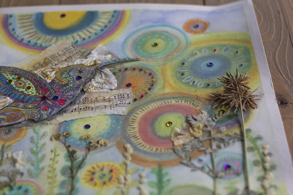 Mixed media: soft pastels, pearlescent aquarelle, beads, a lady bug out of wood, music notes, tissue paper and pressed wild flowers from Avis Dam, Windhoek, Namibia.