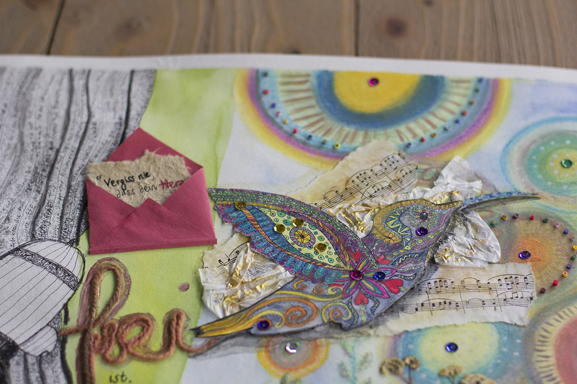 The hummingbird is created by doodling art with black fine liner, coloured in with aquarelle pencils and decorated with a few sparkly beads. The colourful bird conveys joy, freedom and courage.